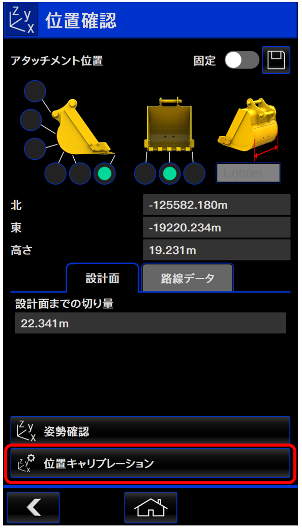 2) バケットのどの位置で測定したいかを「アタッチメント位置」で選択してください。