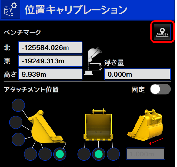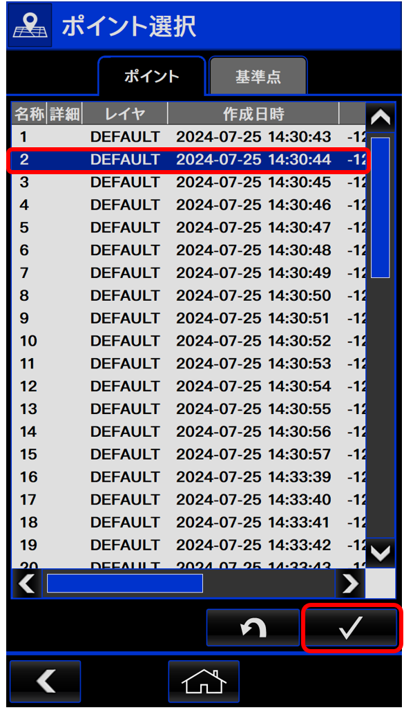 右上にある、ポイント選択のボタンから、該当のベンチマーク(刃先確認用基準点)を選択し チェックボタンを押してください。
