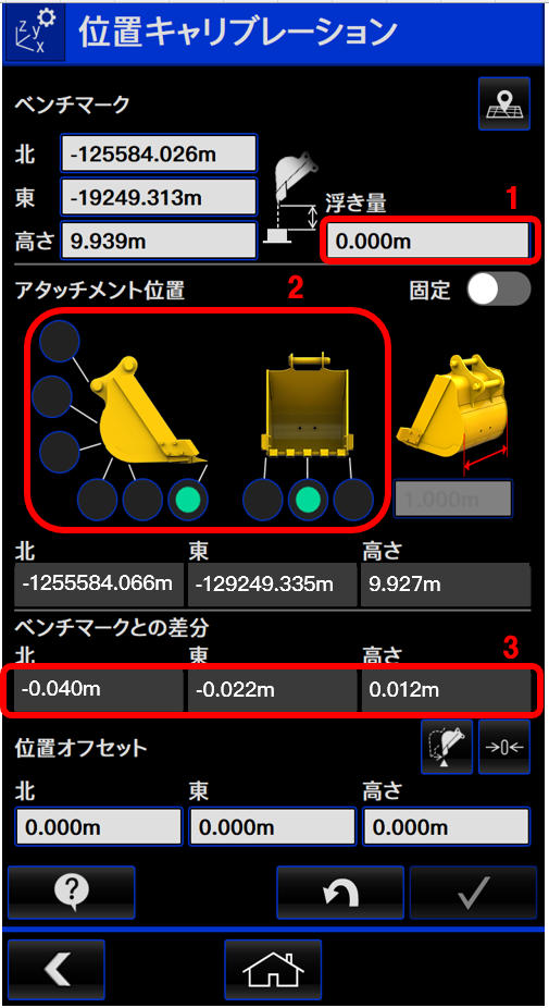 3) 現在のバケットの座標とベンチマークの座標の差が、「ベンチマークとの差分」に表示されます。大きな誤差が出ていないか、ご確認ください。