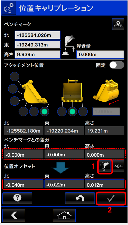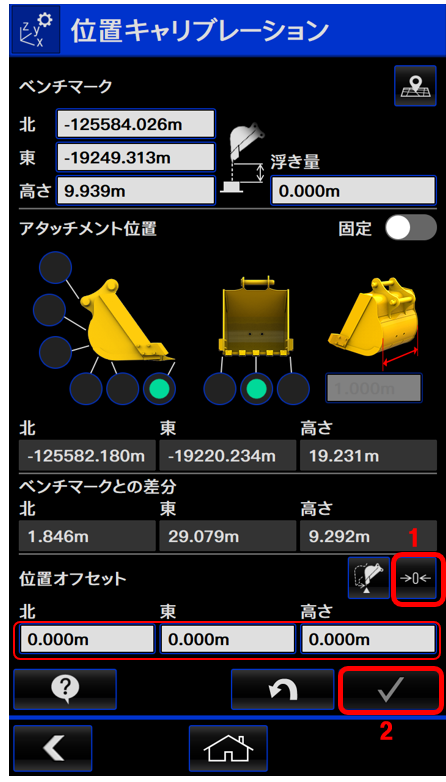 1) 位置オフセットボタンを押すと、「ベンチマークとの差分」の値が「位置オフセット」の値として入力されます。