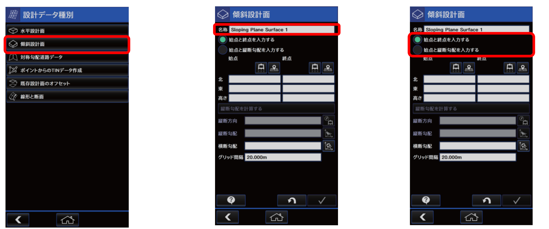 傾斜設計面を作成する場合、「始点と終点を入力する」方法と、「始点と縦断勾配を入力する」方法の2種類があります。