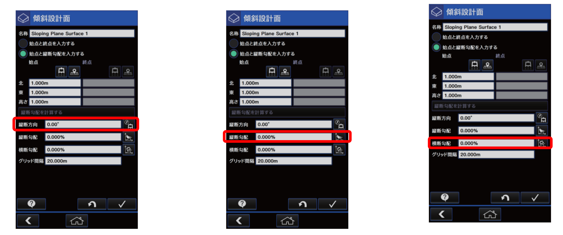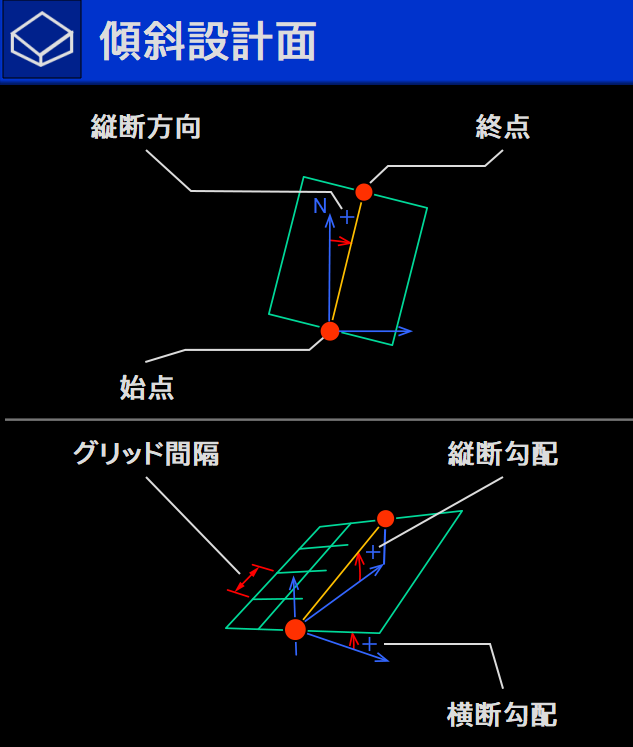 縦断方向の角度と勾配が決定後、さらに横断勾配をつけたい場合、横断勾配の項目に下記を参照し入力してください。