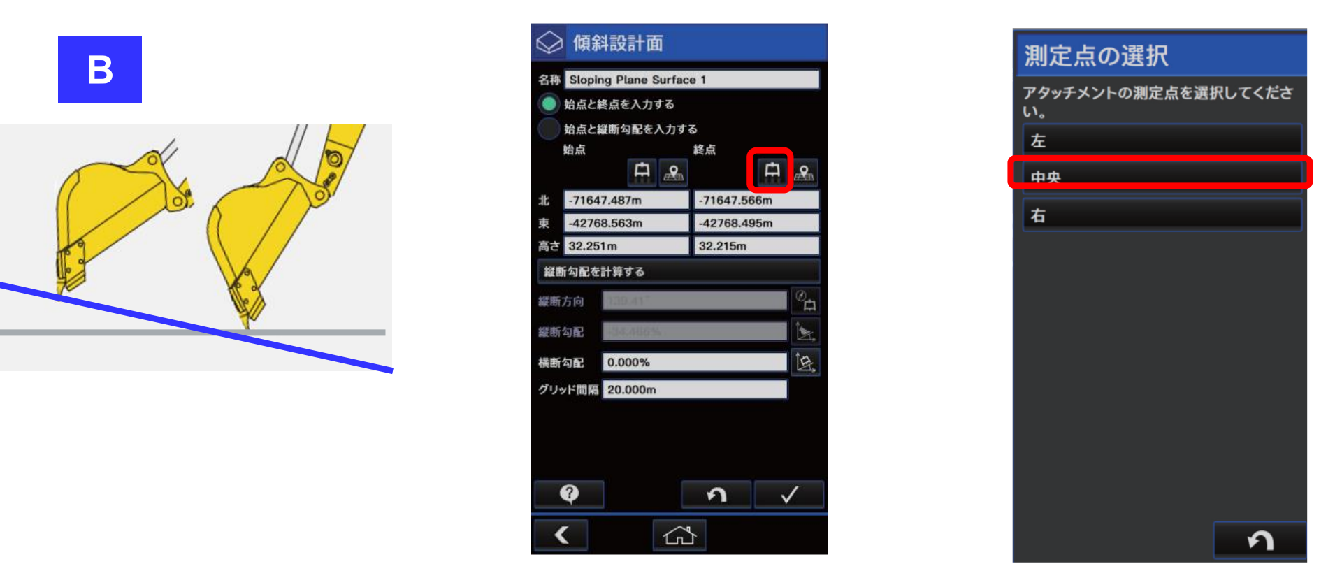 - 終点の「ポイント計測ボタン(バケットのマーク)」をタップ